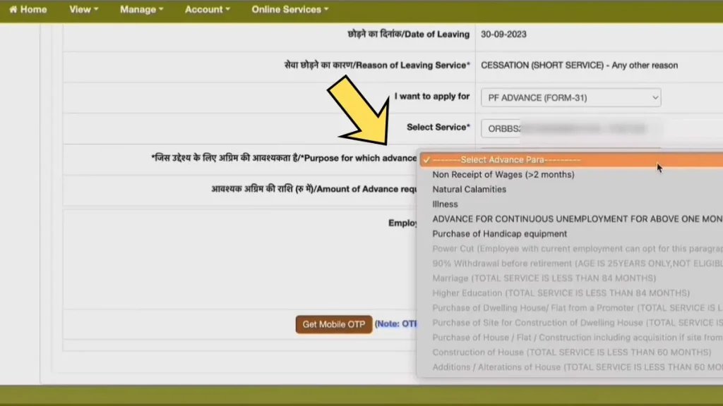 - Select the PF Account and Reason for Withdrawal